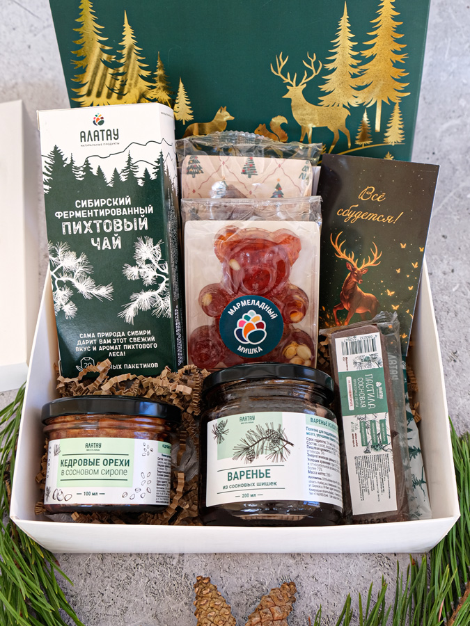 варенье из сосновых шишек 200 мл - 1 шт; кедровые орехи в сосновом сиропе 100 мл - 1 шт; мармеладный медведь с кедровыми орехами 90 гр - 1 шт; мармеладная ёлочка с сосновыми шишками 90 гр - 1 шт; пихтовый чай 20 пак. по 2 гр - 1 шт; пастила сосновая 45 гр - 1 шт; цукаты из сосновых шишек на шпажке 25 гр - 1 шт.